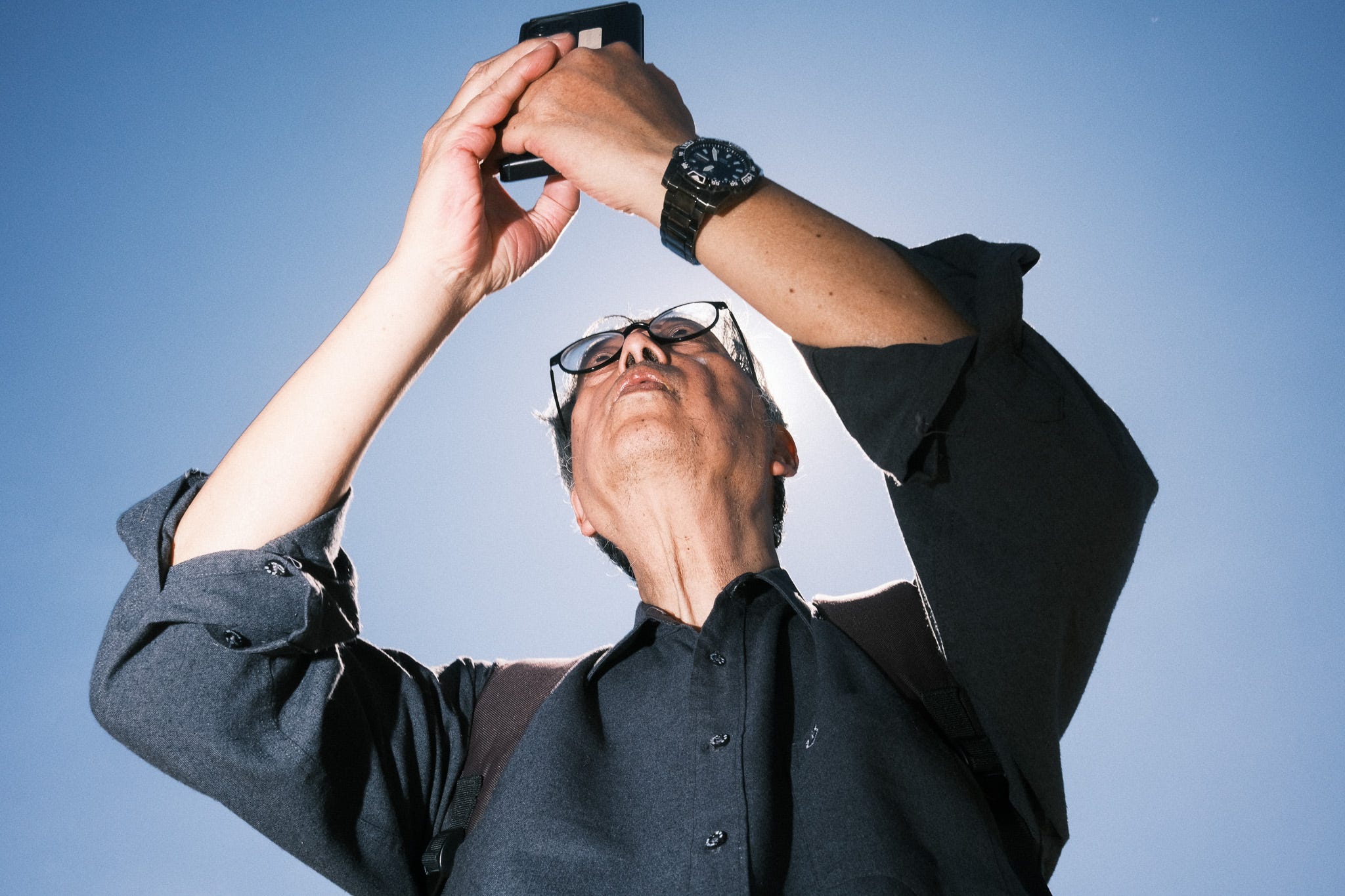 This image was taken at a kite festival, but it is not implying that. Images taken at a festival may be used for any project. This man was photographing the kites with his phone, so I used the opportunity to walk around him in circles shooting from below. I took this shot three times before I was happy. He didn’t notice me because I took the shot as I walked past him and people generally don’t notice flash during the day when the sun is out. This was with a 28mm lens, so I was very close to him. The sun is also directly behind his head.